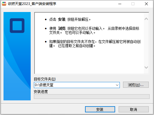 双击左键打开安装程序,选择安装到指定硬盘位置,推荐默认 D:\依燃天堂。等待安装进度完毕后自动启动登陆窗口即完成。